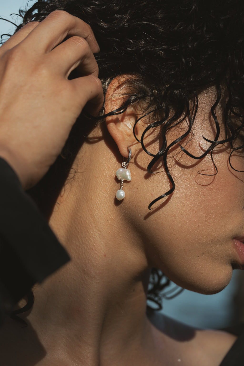 A luminous keshi pearl paired with a classic round pearl, suspended from a sleek sterling silver hoop—an elegant balance of organic form and timeless design.