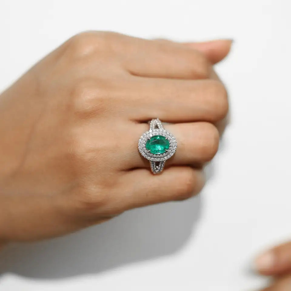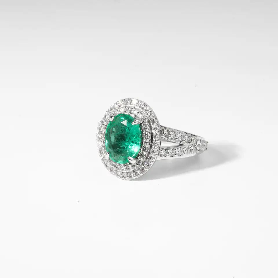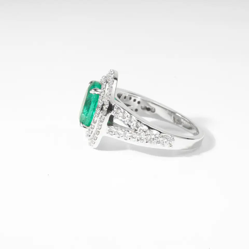 This Double Halo Ring showcases the captivating beauty of a 1.96ct natural oval-cut emerald, renowned for its rich, vibrant green hue. Framed by a double halo of approx. 0.87ct natural round-cut diamonds, each stone is meticulously hand-set to maximize brilliance and elegance. The split band design, crafted in 18K white gold with an approximate weight of 6.9 grams, enhances the grandeur of the setting while maintaining a sophisticated balance of glamour and refinement.