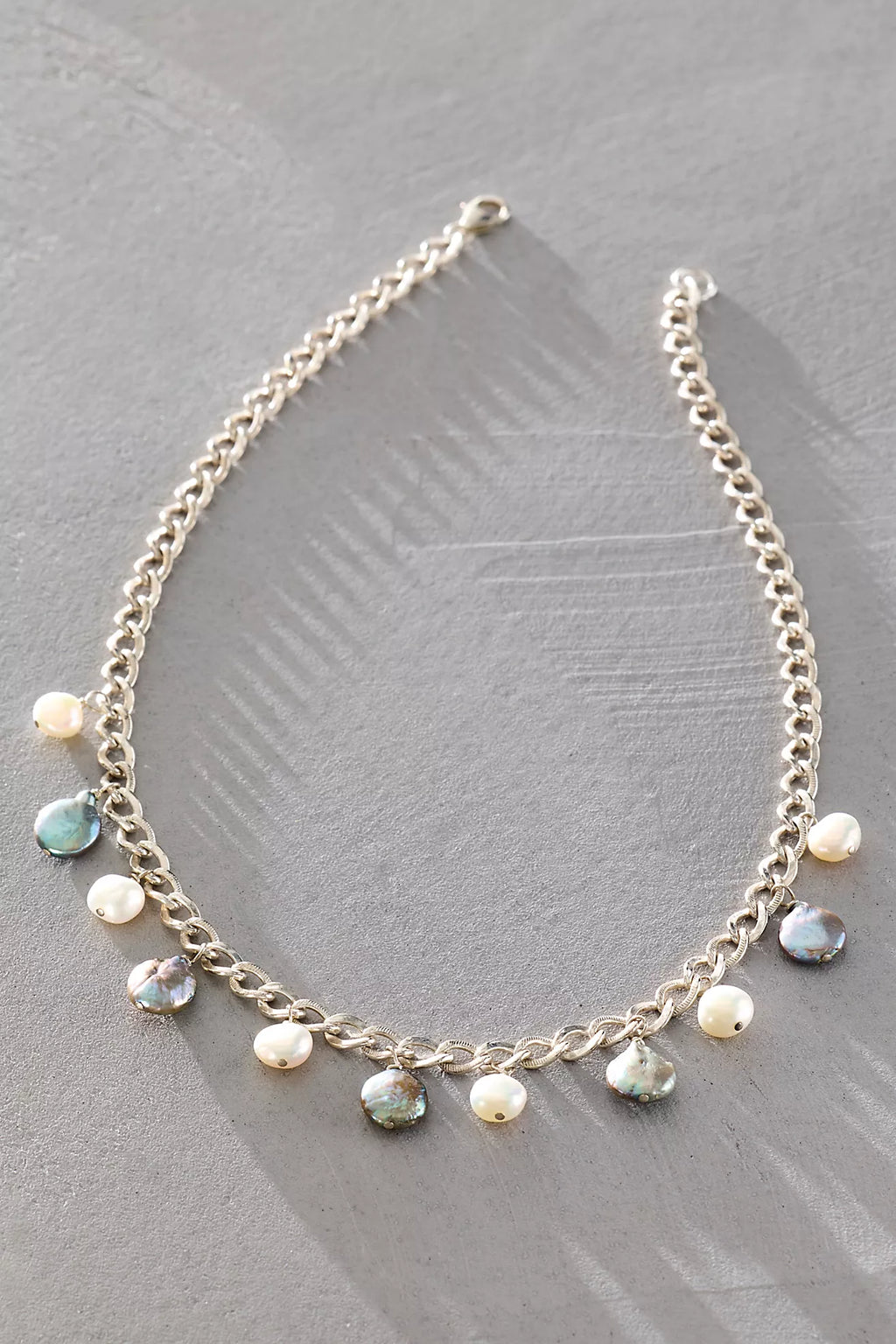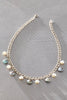 A 925 sterling silver chain adorned with a mix of freshwater pearl charms—featuring ocean-hued blue and classic round pearls. Together, they evoke an air of quiet opulence and otherworldly allure.