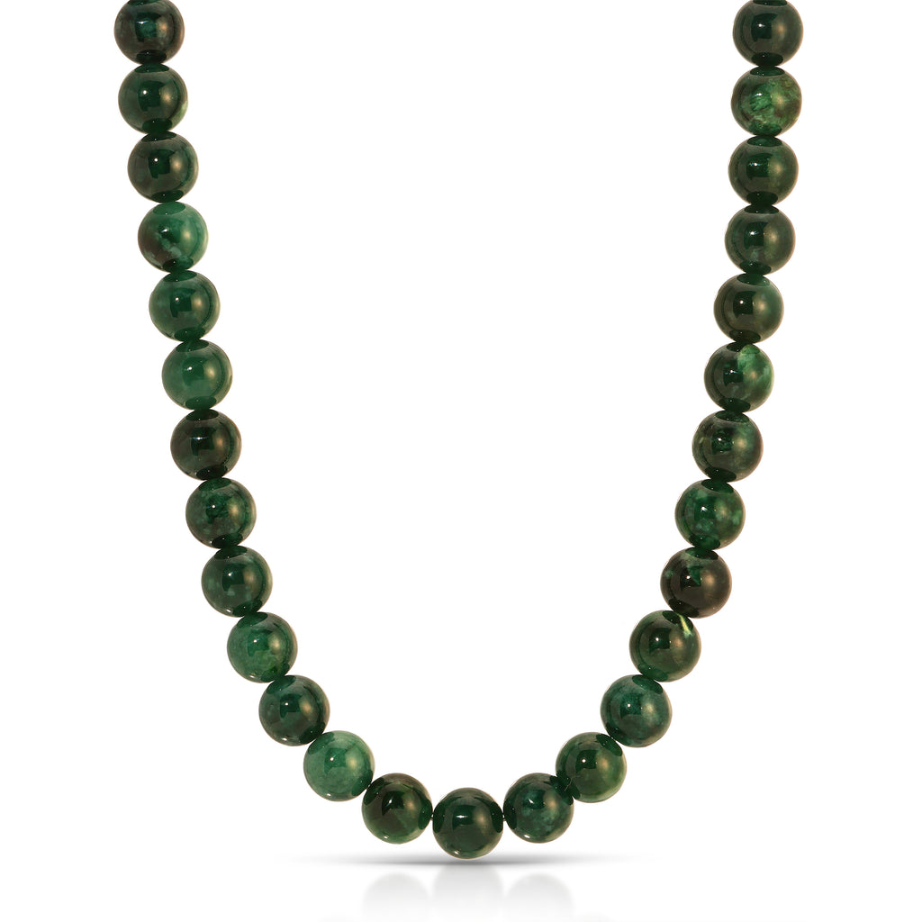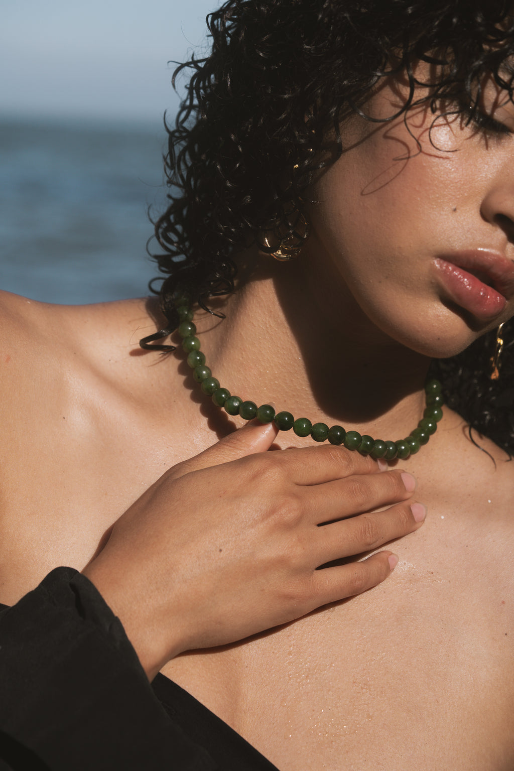 A statement necklace of natural green jade beads, rich in earthy elegance, finished with a 925 sterling silver clasp—an embodiment of timeless strength and refined artistry.