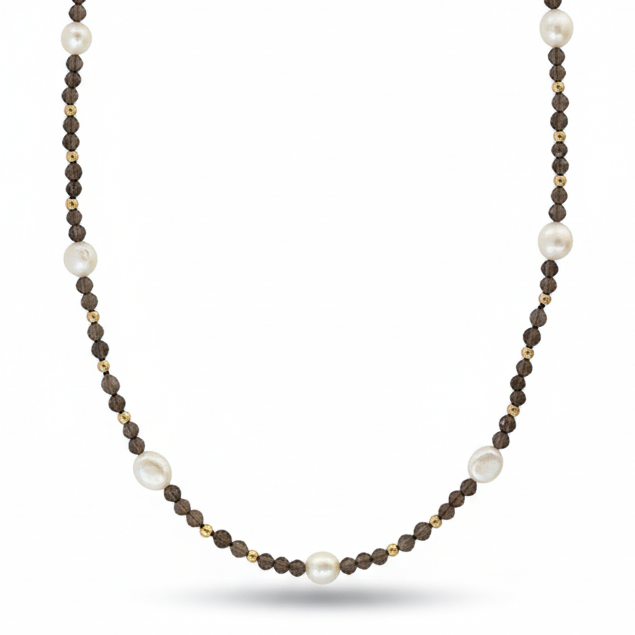 Earthy elegance meets timeless grace in this handcrafted necklace, featuring luminous freshwater pearls paired with rich smoky quartz beads. The warm, grounding tones of quartz balance beautifully with the soft luster of pearls, creating a piece that is both refined and versatile. Made by hand in Los Angeles, it’s a necklace designed to move effortlessly from day to night, adding depth and sophistication to any look.